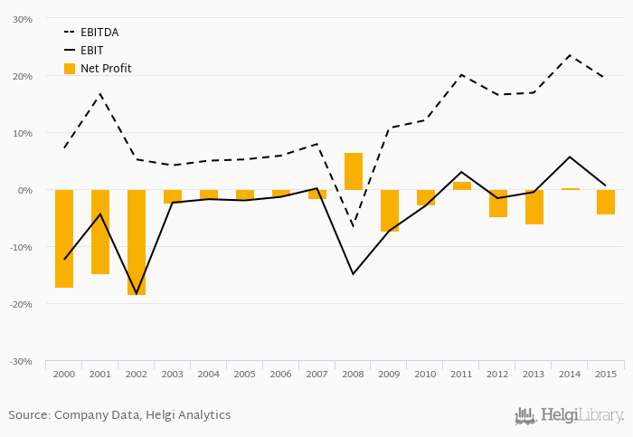 This translates into a net margin of -4.24%. Historically, between 2000 and 2015, the firm’s net margin reached a high of 6.55% in 2008 and a low of -18.5% in 2002. The average net margin in the last five years amounted to -2.66%.