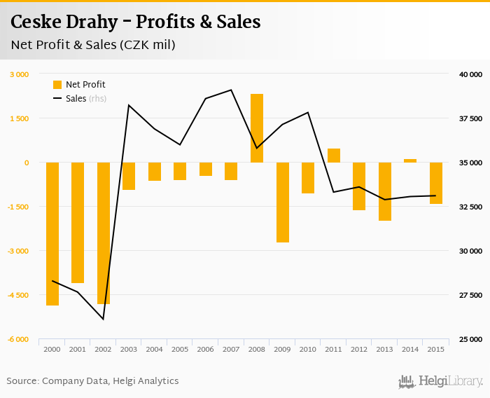 Ceske Drahy made a net profit of CZK -1,402 mil in 2015, down 1% compared to the previous year. Total sales reached CZK 33,083 mil, which is up 0.143% when compared to the previous year.