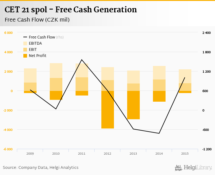 CET 21 spol made a net profit of CZK -212 mil with revenues of CZK 7,946 mil in 2015, up by 81% and up by 8.45%, respectively, compared to the previous year. This translates into a net margin of -2.67%.