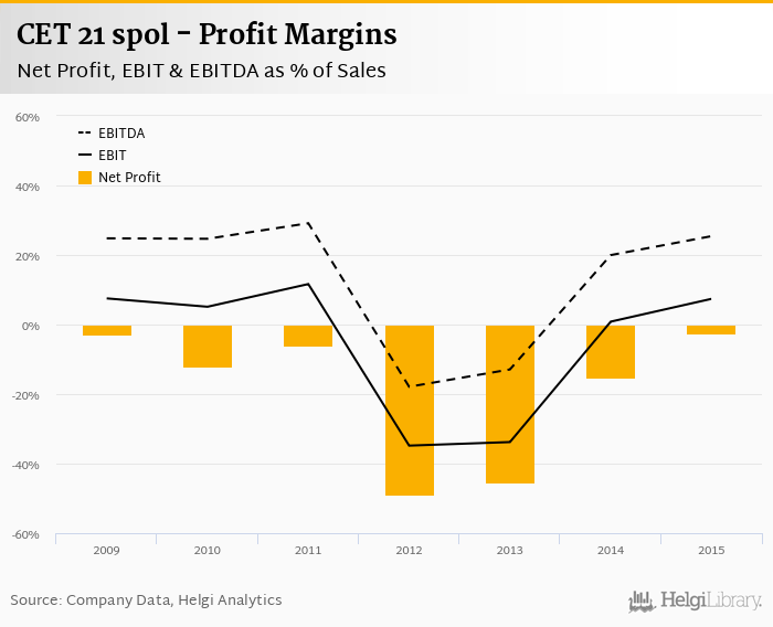 CET 21 spol made a net profit of CZK -212 mil with revenues of CZK 7,946 mil in 2015, up by 81% and up by 8.45%, respectively, compared to the previous year.