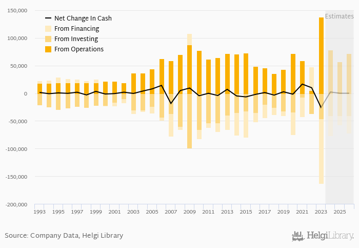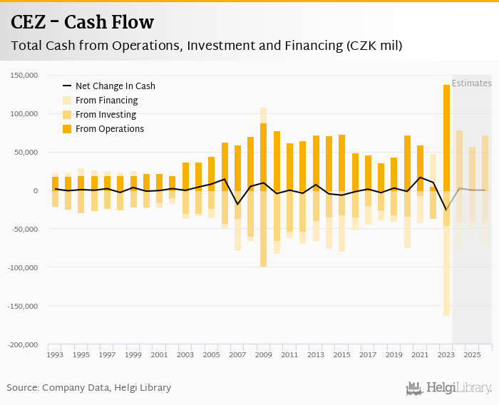Cash from financing amounted to CZK -116,951 mil, so the company generated CZK -25,717 mil net cash in 2023.
