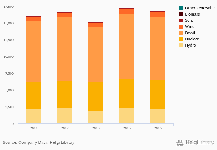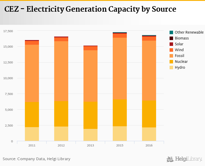 At the end of 2016, CEZ’s total installed electricity generating capacity was 16,843 MW, down 2.65% compared to a year earlier. Most of the capacity was still installed with fossil fuels and coal in particular (56.5% of total), nuclear power plants provided 25.5% while capacity from renewables excluding hydro accounted for 5.10%.
