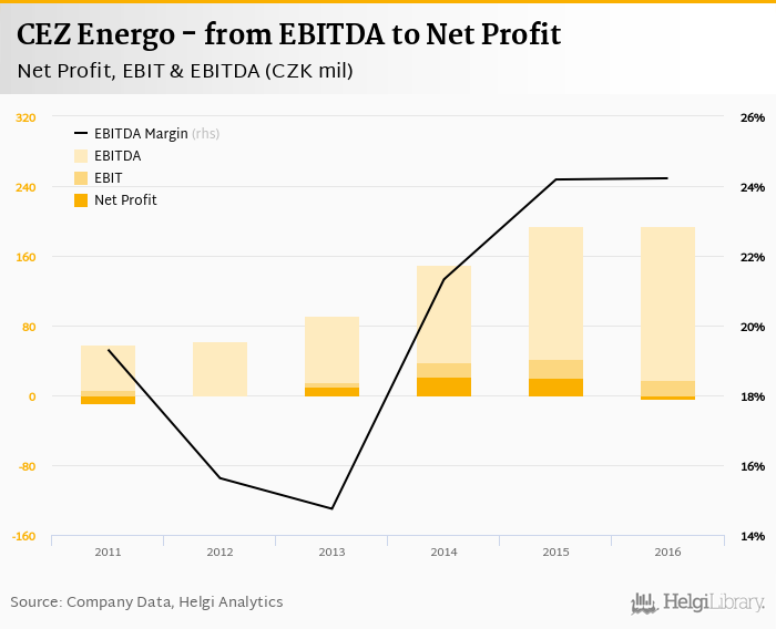 CEZ Energo made a net profit of CZK -3.38 mil with revenues of CZK 789 mil in 2016, down by 116% and down by 1.98%, respectively, compared to the previous year. This translates into a net margin of -0.429%.