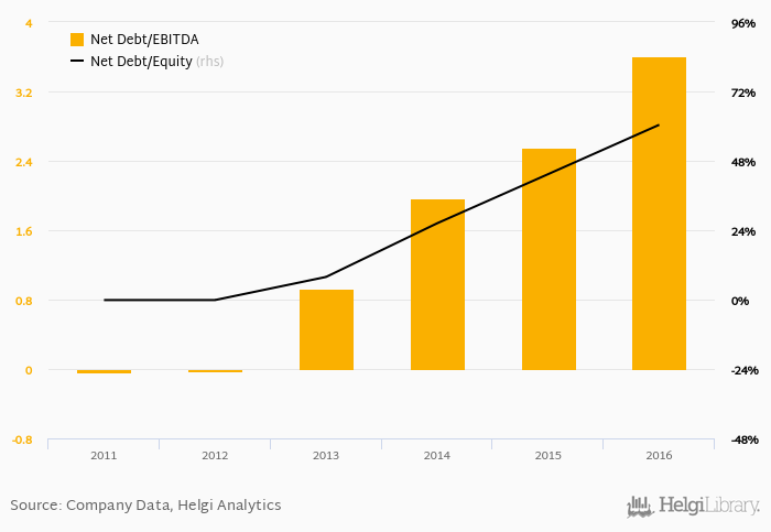 Historically, the firm’s net debt to equity reached a high of 60.5% in 2016 and a low of -0.158% in 2012 between 2011 and 2016. The average for the last five years was 27.6%.