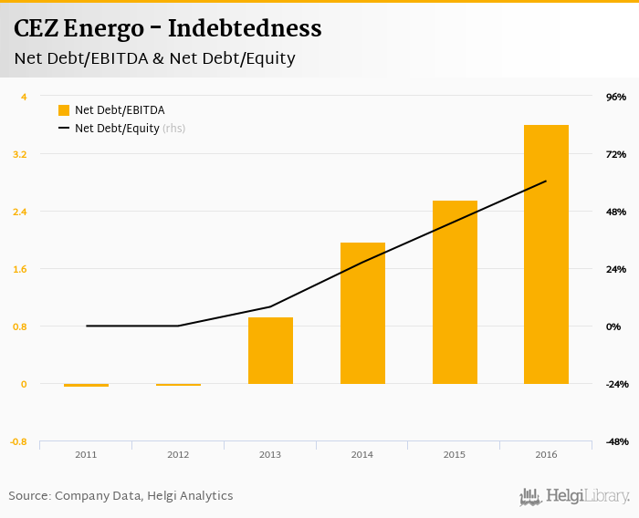 CEZ Energo's net debt stood at CZK 689 mil and accounted for 60.5% of equity at the end of 2016. The ratio is up 17.1 pp compared to the previous year.