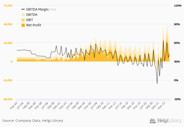 Historically, between 1Q1993 - 1Q2024, the firm’s net profit reached a high of CZK 28,447 mil in 3Q2023 and a low of CZK -7,823 mil in 3Q2021. Since 1Q2019, the firm's net profit has increased 16.6% or 3.13% a year on average.