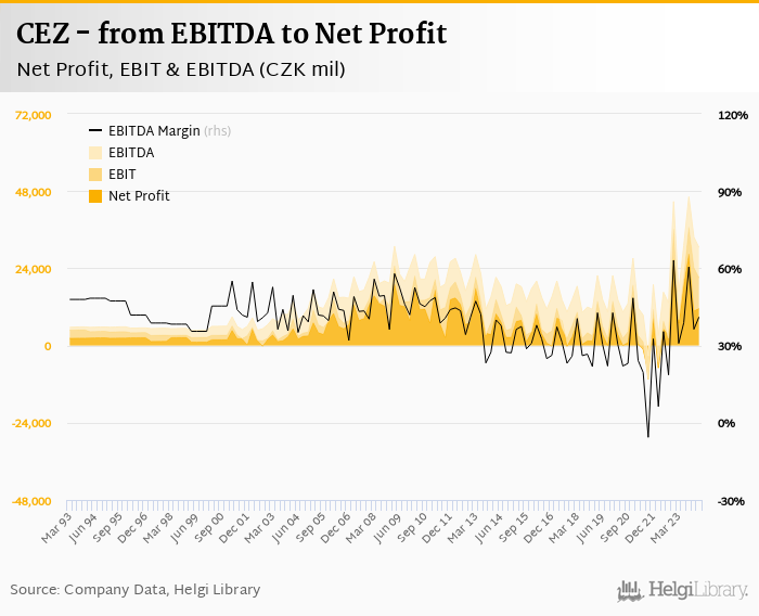 CEZ made a net profit of CZK 11,458 mil with revenues of CZK 74,266 mil in 1Q2024, up by 6.37% and down by 20%, respectively, compared to the previous year. This translates into a net margin of 15.4%.