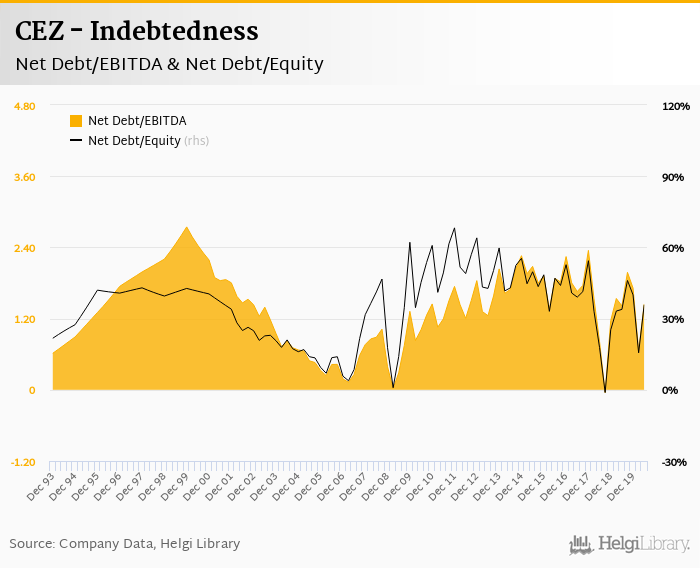 CEZ's net debt stood at CZK 90,112 mil and accounted for 35.8% of equity at the end of 2Q2020. The ratio is up 1.94 pp compared to the previous year.
