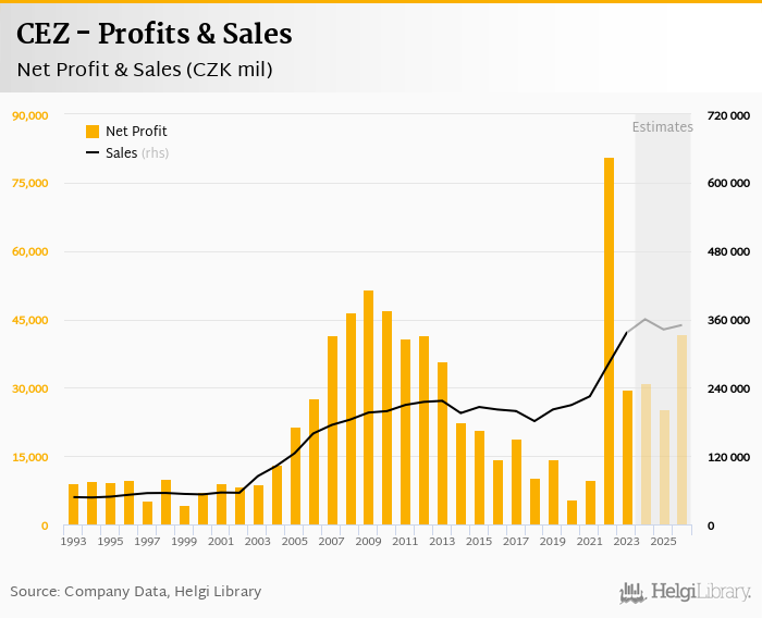 Historically, between 1993 and 2023, the company’s net profit reached a high of CZK 80,786 mil in 2022 and a low of CZK 4,290 mil in 1999. Over the last decade the firm's net profit decreased by an average of 1.93% a year.