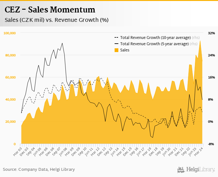 CEZ generated sales of CZK 74,266 mil in 1Q2024, up 38% compared to the previous year. Historically, between 1Q1993 and 1Q2024, the company’s sales reached a high of CZK 92,777 mil in 4Q2023 and a low of CZK 11,661 mil in 1Q1994.