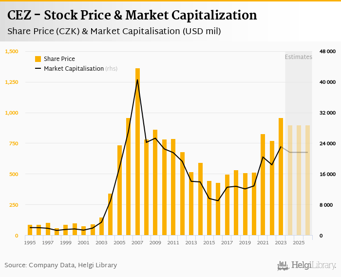 CEZ stock traded at CZK 959 per share at the end 2023 implying a market capitalization of USD 23,056 mil.