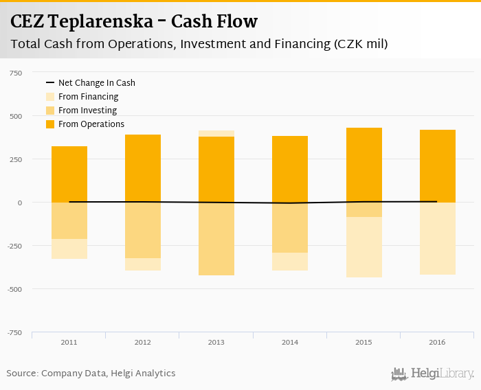 Cash from financing amounted to CZK -417 mil, so the company generated CZK 1.25 mil net cash in 2016.