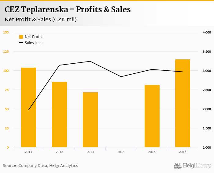 CEZ Teplarenska made a net profit of CZK 115 mil in 2016, up 40.9% compared to the previous year. Total sales reached CZK 2,961 mil, which is down 2.11% when compared to the previous year.