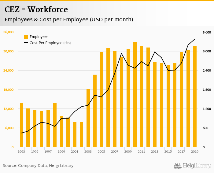 CEZ employed 31,572 employees in 2019, up 3.36% compared to the previous year. Historically, between 1993 and 2019, the firm's workforce hit a high of 32,937 employees in 2010 and a low of 7,806 employees in 2001.