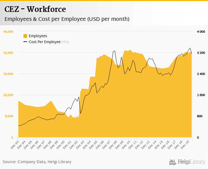 CEZ employed 31,900 employees in 2Q2020, down 0.313% compared to the previous year. Historically, between 4Q1993 and 2Q2020, the firm's workforce hit a high of 32,937 employees in 4Q2010 and a low of 7,138 employees in 1Q2003.