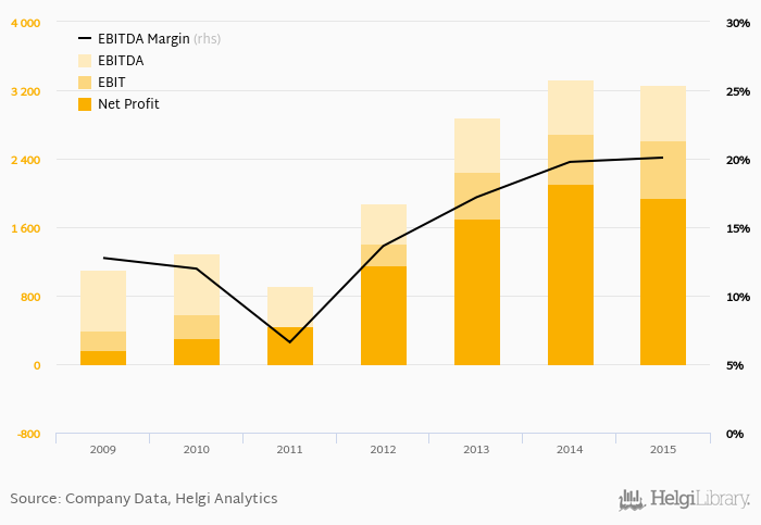 Historically, between 2009 - 2015, the firm’s net profit reached a high of CZK 2,109 mil in 2014 and a low of CZK 165 mil in 2009. Since 2010, the firm's net profit has increased 542% or 45.0% a year on average.