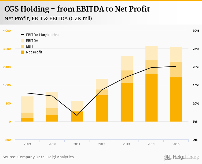 CGS Holding made a net profit of CZK 1,940 mil with revenues of CZK 16,269 mil in 2015, down by 8% and down by 3.18%, respectively, compared to the previous year. This translates into a net margin of 11.9%.
