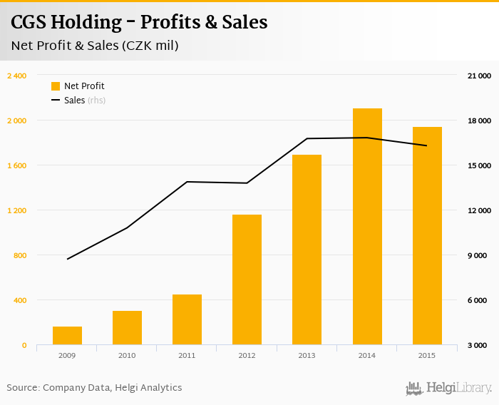 CGS Holding made a net profit of CZK 1,940 mil in 2015, down 8% compared to the previous year. Total sales reached CZK 16,269 mil, which is down 3.18% when compared to the previous year.