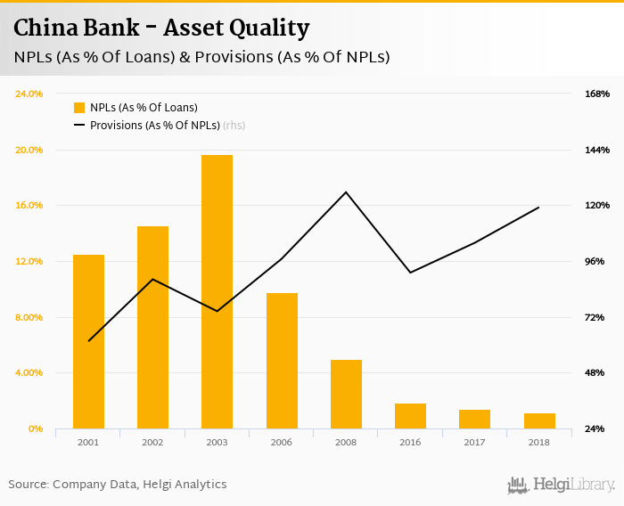China Bank's non-performing loans reached 1.16% of total loans at the end of 2018, down from 1.41% compared to the previous year. Historically, the NPL ratio hit an all time high of 19.7% in 2003 and an all time low of 1.16% in 2018.