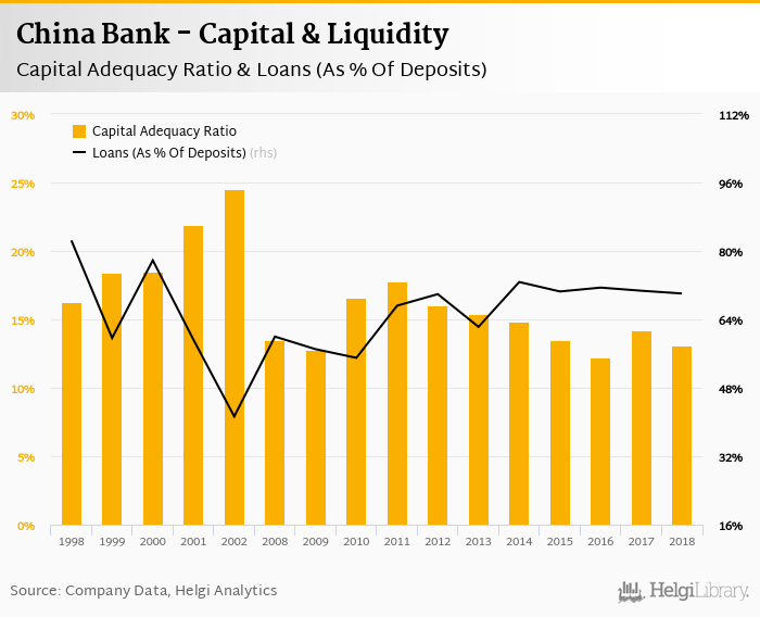China Bank's capital adequacy ratio reached 13.1% at the end of 2018, down from 14.2% compared to the previous year. Historically, the bank’s capital ratio hit an all time high of 24.5% in 2002 and an all time low of 12.2% in 2016.