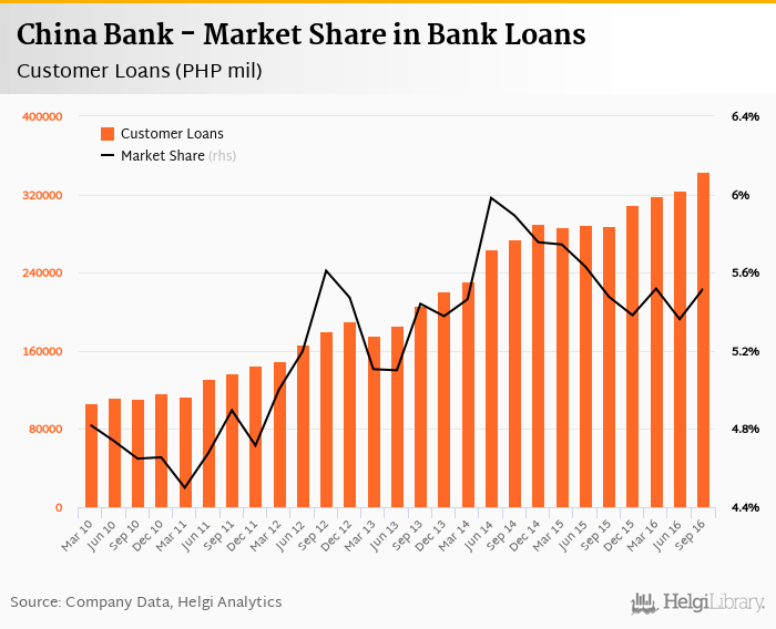 China Bank's customer loans reached PHP 343,096 mil in 2016-09-30, up 5.89% compared to the previous year.