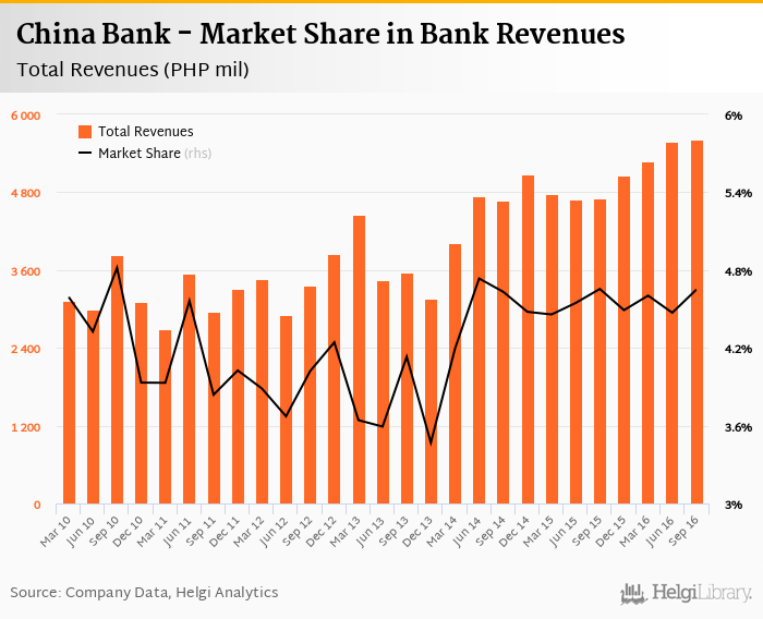As a result, China Bank accounted for 4.65% of all bank revenues generated by banks in Philippines in 2016-09-30. Historically, the bank’s market share in total revenues reached an all time high of 4.82% in 2010-09-30 and an all time low of 3.47% in 2013-12-31.