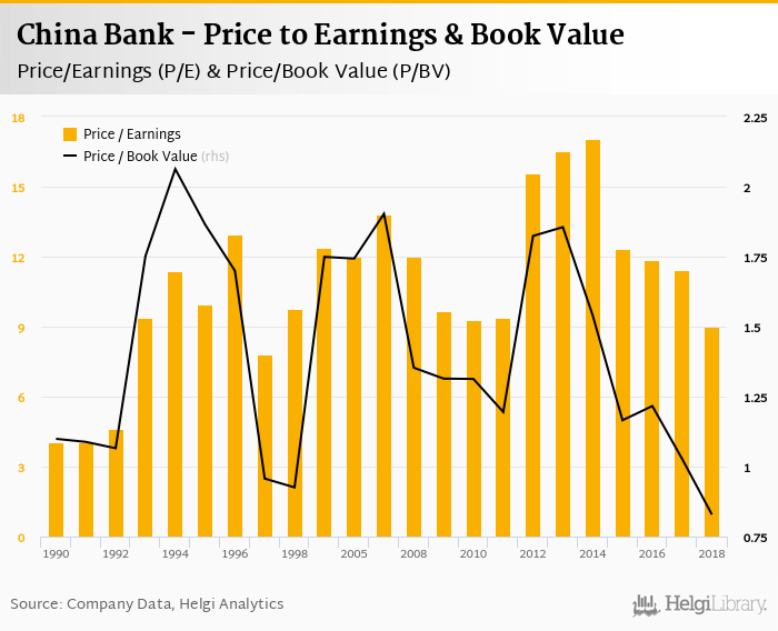 At the end of 2018, the bank traded at price to earnings of 9.02x. Within the last five years, the multiple reached an all time high of 17.0x in 2014 and an all time low of 9.02x in 2018 with an average of 12.3x.