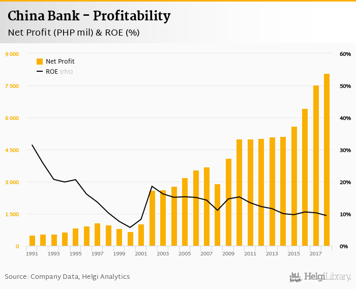 China Bank made a net profit of PHP 8,072 mil in 2018, up 7.24% compared to the previous year. This implies a return on equity of 9.41%.