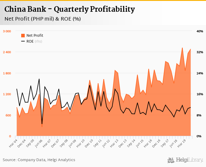 China Bank made a net profit of PHP 2,483 mil in the third quarter of 2019, up 24.6% when compared to the same period of last year. This implies a return on equity of 10.8%.