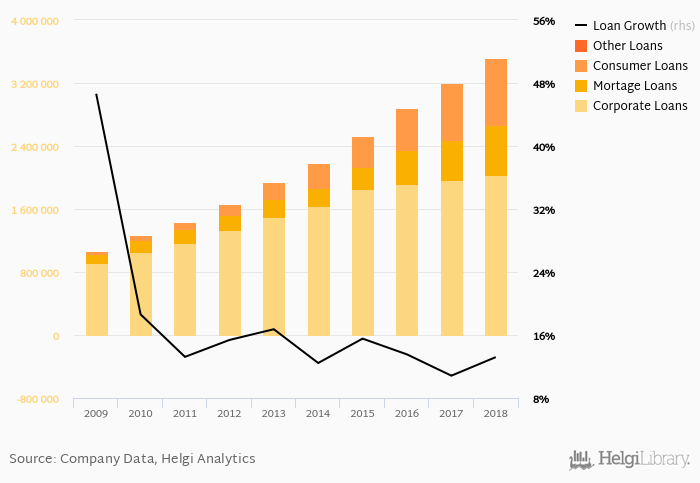 Mortgage loans represented 18.3% of the bank's loan book at the end of the year 2018, consumer further 23.9% and corporate loans 57.6% of total loans.