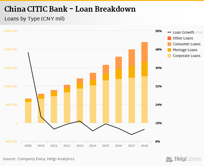 China CITIC Bank's loans reached CNY 3,520,230 mil in the 2018, up from CNY 3,196,890 mil compared to the previous year. Historically, the bank’s loans reached an all time high of CNY 3,520,230 mil in 2018 and an all time low of CNY 1,065,650 mil in 2009.