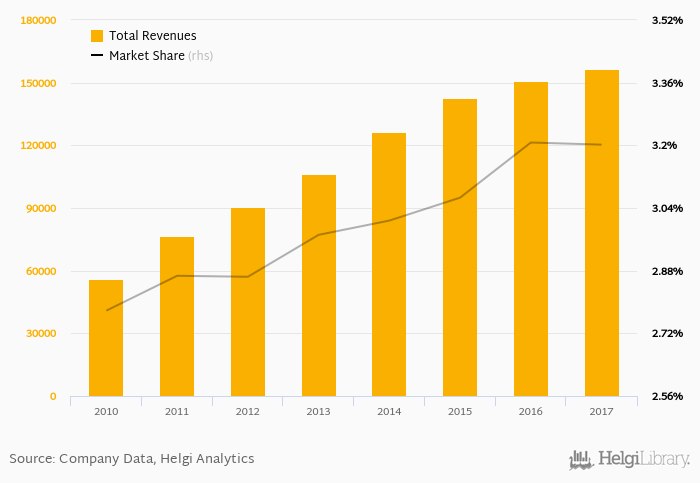 As a result, China CITIC Bank accounted for 3.20% of all bank revenues generated by banks in China in 2017. Historically, the bank’s market share in total revenues reached an all time high of 3.21% in 2016 and an all time low of 2.78% in 2010.