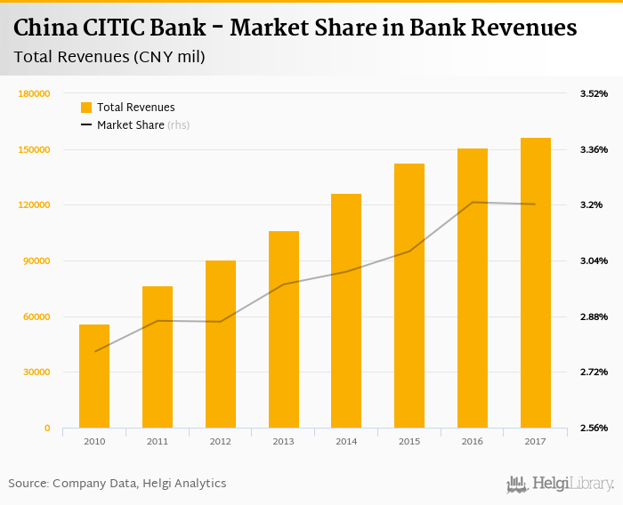 China CITIC Bank generated total banking revenues of CNY 156,443 mil in 2017, up 3.83% compared to the previous year.