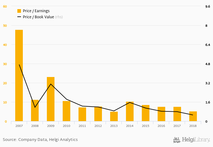 In terms of price to book value, the stock reached 0.514x at the end of 2018. Since 2013, the multiple reached an all time high of 1.56x in 2014 and an all time low of 0.514x in 2018 with an average of 0.957x.