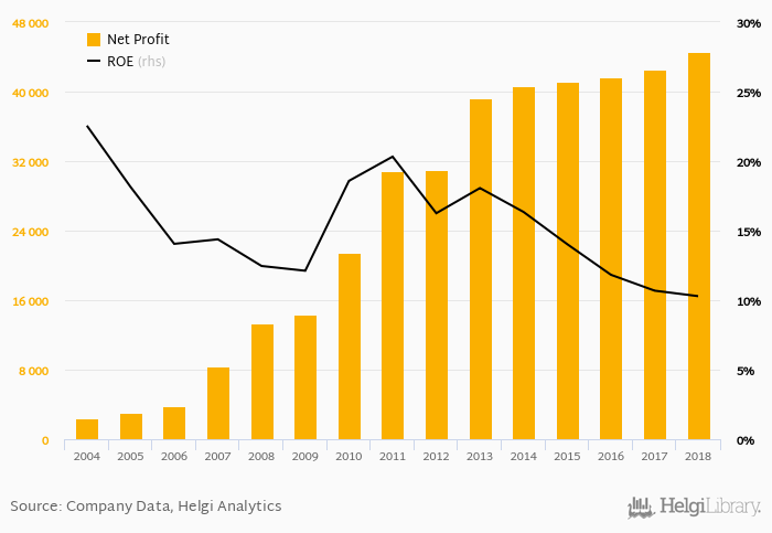 Historically, the bank’s net profit reached an all time high of CNY 44,513 mil in 2018 and an all time low of CNY 2,427 mil in 2004. The average profit in the last five years amounted to CNY 42,112 mil.