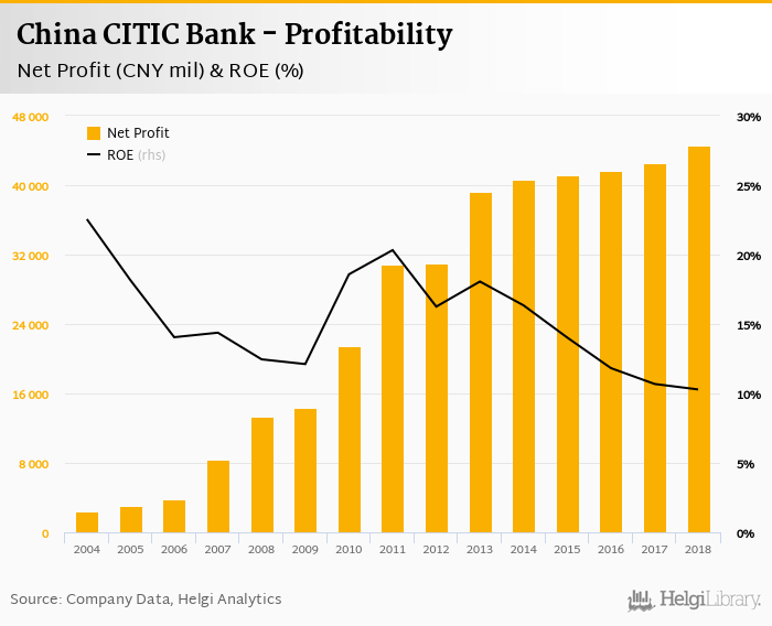 China CITIC Bank made a net profit of CNY 44,513 mil in 2018, up 4.57% compared to the previous year. This implies a return on equity of 10.3%.