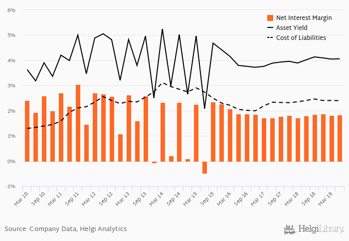 Historically, the bank’s net interest margin reached an all time high of 3.04% in 3Q2011 and an all time low of -0.479% in 2Q2015. The average margin in the last six quarters amounted to 1.82%.