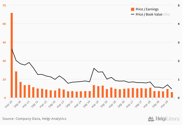 At the end of 2Q2019, the bank traded at price to earnings of 4.62x. Within the last five years, the multiple reached an all time high of 10.4x in 4Q2014 and an all time low of 4.62x in 2Q2019 with an average of 7.35x.