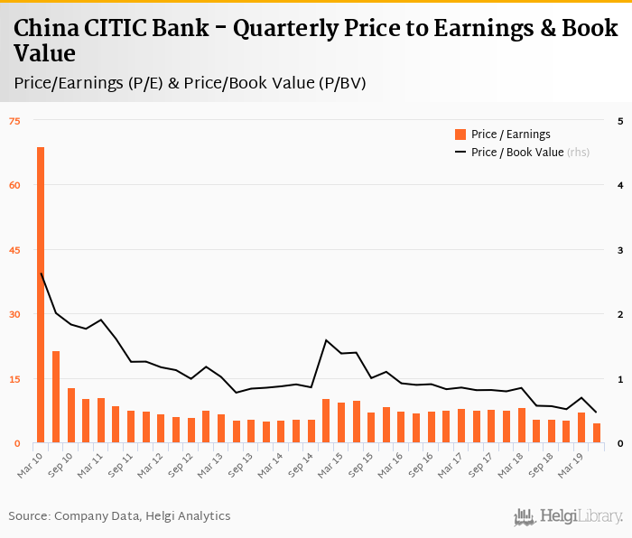 China CITIC Bank stock traded at HKD 3.91 per share at the end second quarter of 2019 implying a market capitalization of USD 27,866 mil.