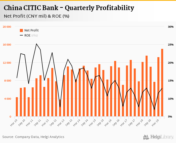 China CITIC Bank made a net profit of CNY 15,091 mil in the second quarter of 2019, up 11.3% when compared to the same period of last year. This implies a return on equity of 12.8%.