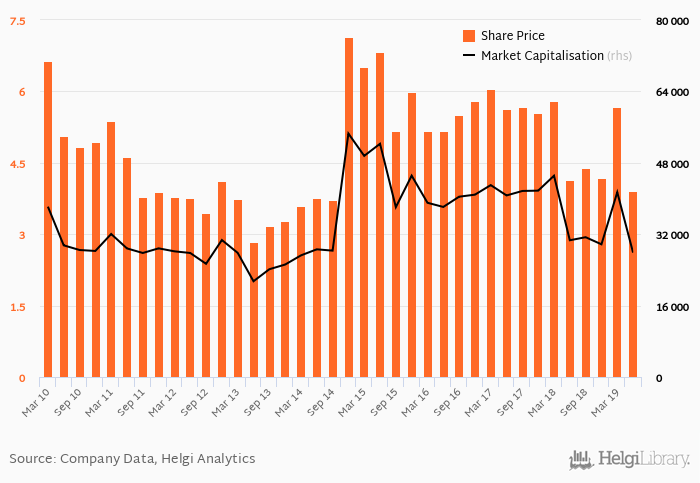 Over the last five years, the stock has appreciated by 3.98 % implying an annual average growth of 0.784 %. In absolute terms, the value of the company fell by USD -744 mil.