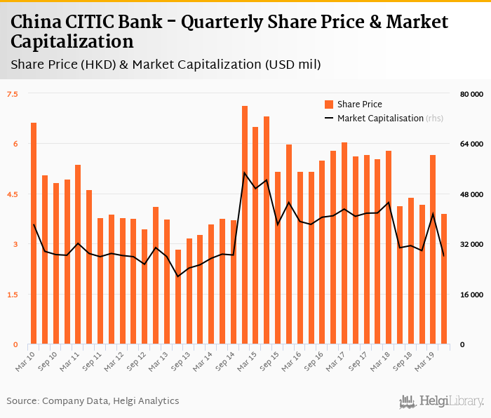 China CITIC Bank stock traded at HKD 3.91 per share at the end of second quarter of 2019 implying a market capitalization of USD 27,866 mil.