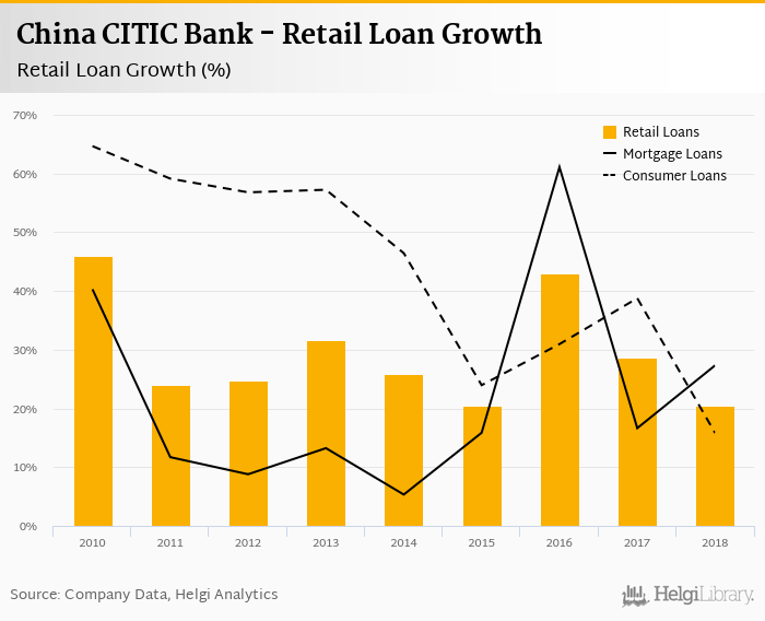 China CITIC Bank's retail loans reached CNY 1,484,490 mil at the end of 2018, up 20.5% compared to the previous year. In the last decade, the average annual loan growth amounted to 0%.
