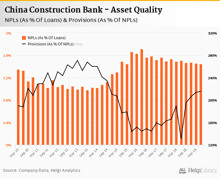 Comparing China Construction Bank with its closest peers, Home Credit China operated at the end of 2019-06-30 with NPL ratio of 1.39% and provision coverage of 846% and Qudian with 5.62% and 133% respectively.