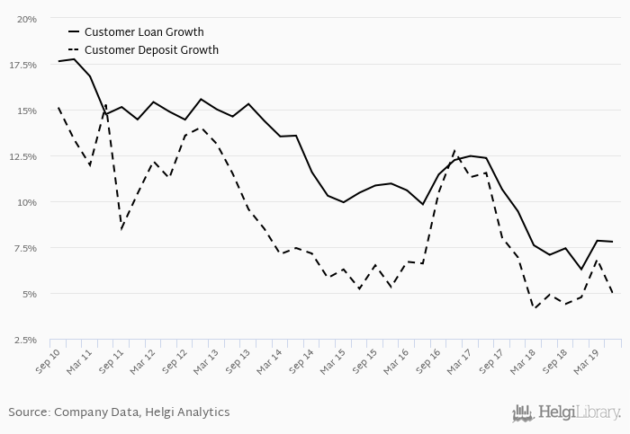 On the other hand, bank's customer deposit growth amounted to 4.95% at the end of 2019-06-30, up from 4.90% when compared to the previous year. Historically, the bank’s deposit growth reached an all time high of 15.3% in 2011-06-30 and an all time low of 4.11% in 2018-03-31. In the last decade, the average annual loan growth amounted to 0%.