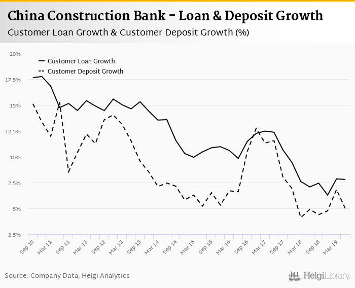 China Construction Bank's customer loan growth reached 7.80% in 2019-06-30, up from 7.08% compared to the previous year. Historically, the bank’s loans growth reached an all time high of 17.8% in 2010-12-31 and an all time low of 6.29% in 2018-12-31. In the last decade, the average annual loan growth amounted to 0%.