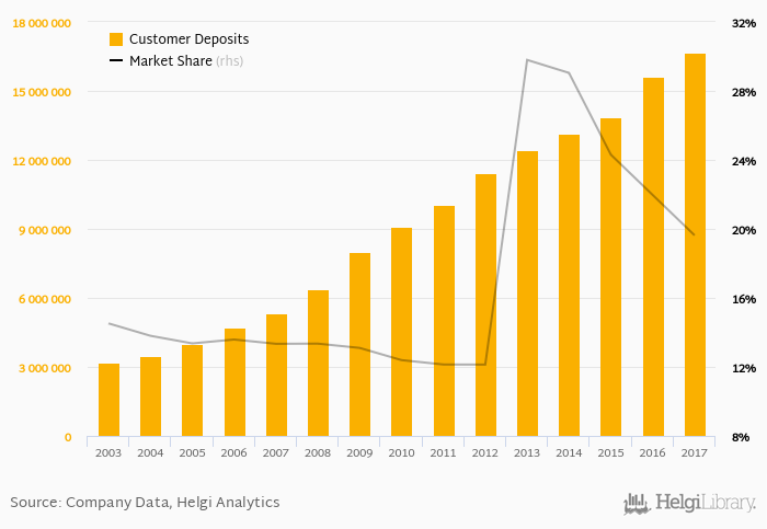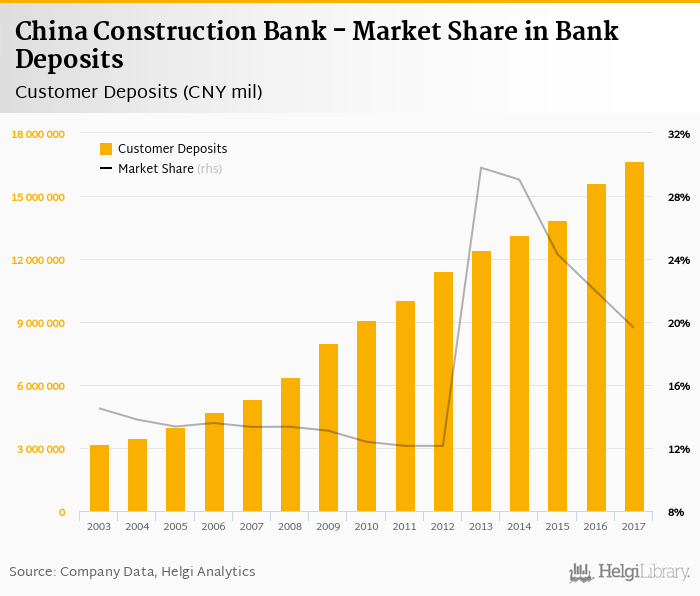 China Construction Bank accounted for 19.6% of all customer deposits taken by banks in China at the end of 2017. Historically, the bank’s market share in customer deposits reached an all time high of 29.8% in 2013 and an all time low of 11.3% in 2018.