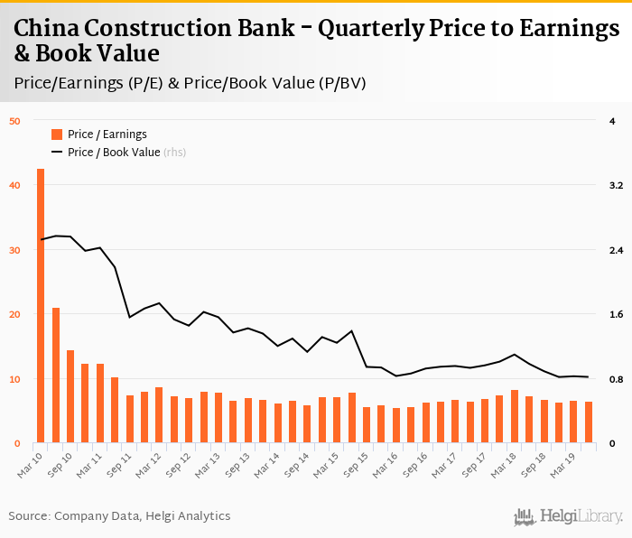 China Construction Bank stock traded at HKD 5.92 per share at the end second quarter of 2019 implying a market capitalization of USD 189,398 mil.
