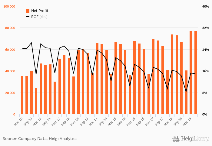 Historically, the bank’s net profit reached an all time high of CNY 77,274 mil in 2Q2019 and an all time low of CNY 24,345 mil in 4Q2010. The average profit in the last six quarters amounted to CNY 68,141 mil.