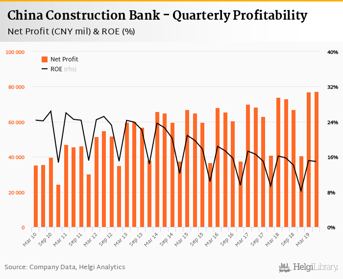 China Construction Bank made a net profit of CNY 77,274 mil in the second quarter of 2019, up 5.55% when compared to the same period of last year. This implies a return on equity of 14.9%.